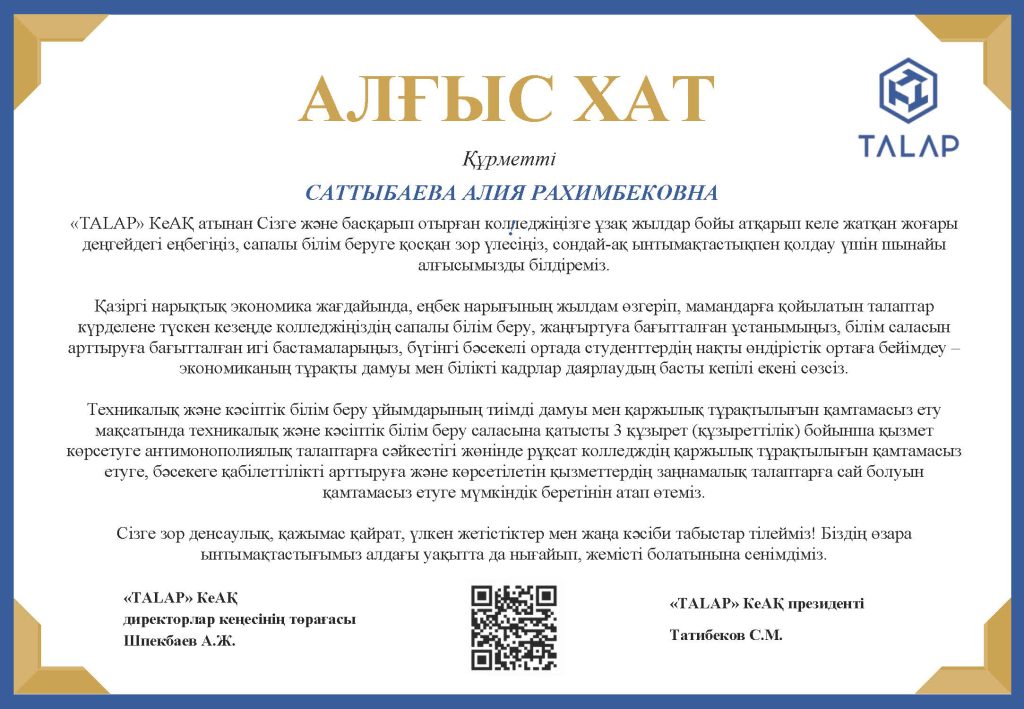 Жұмысшы мамандықтар жылы аясында жұмысшы мамандықтарын насихаттауға және еңбек адамының имиджін қалыптастыруға қосқан үлесі үшін.