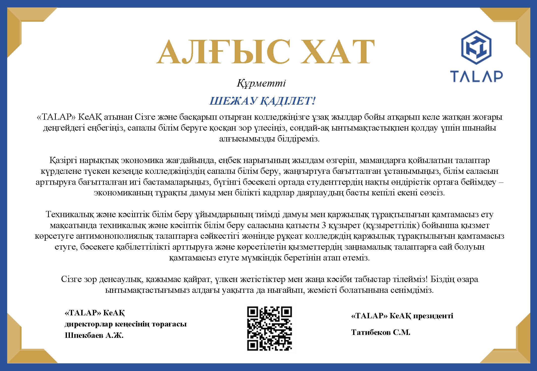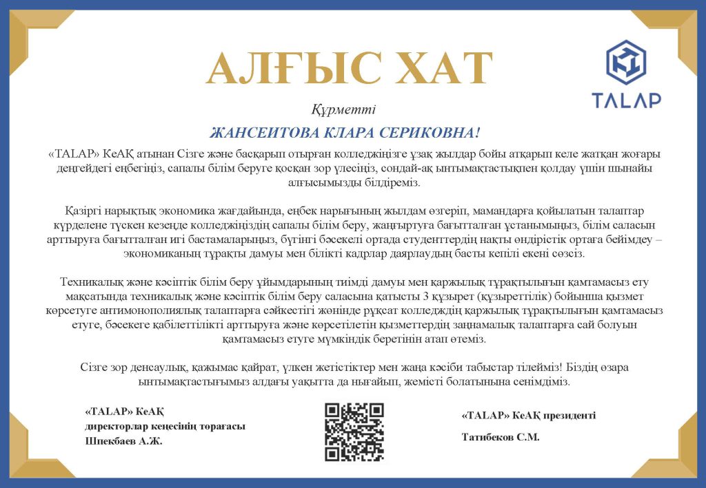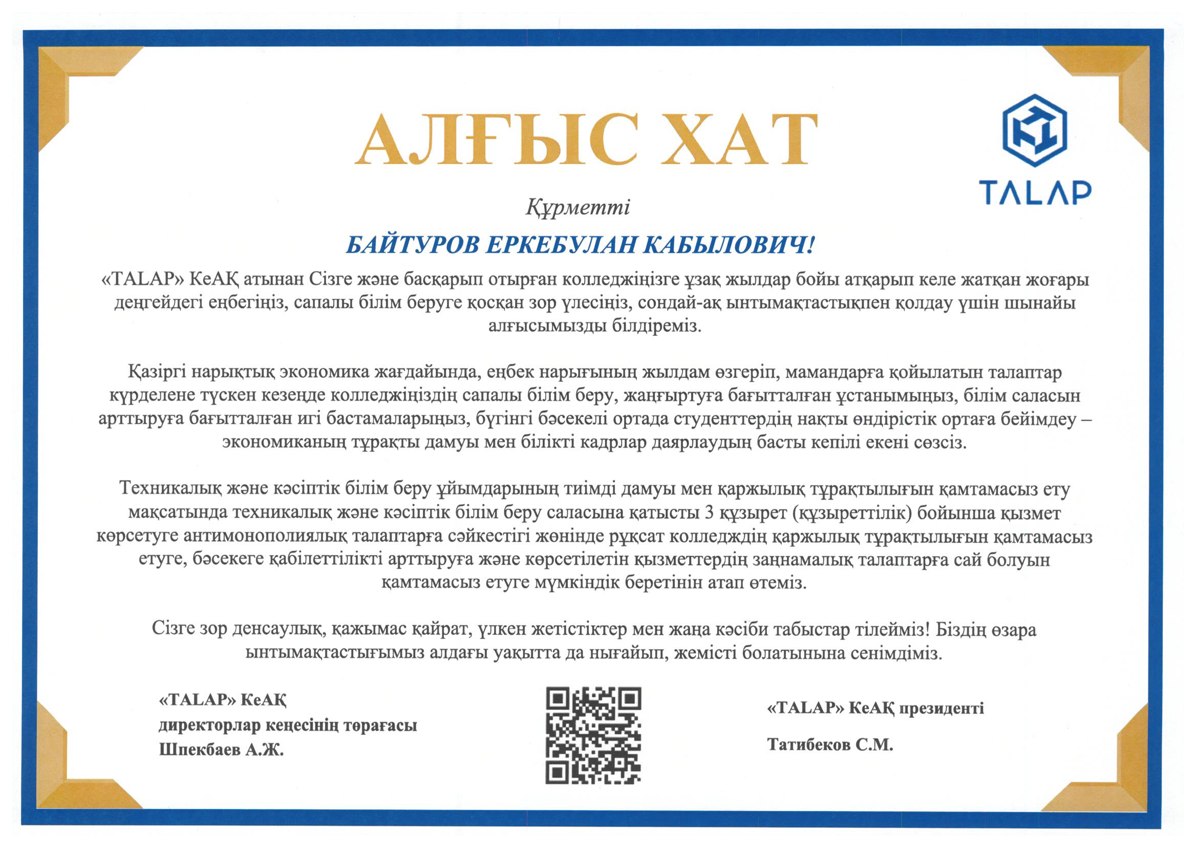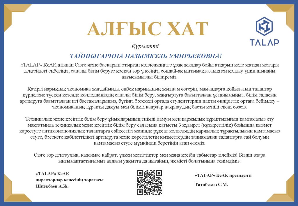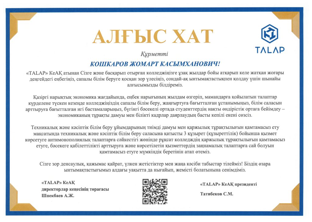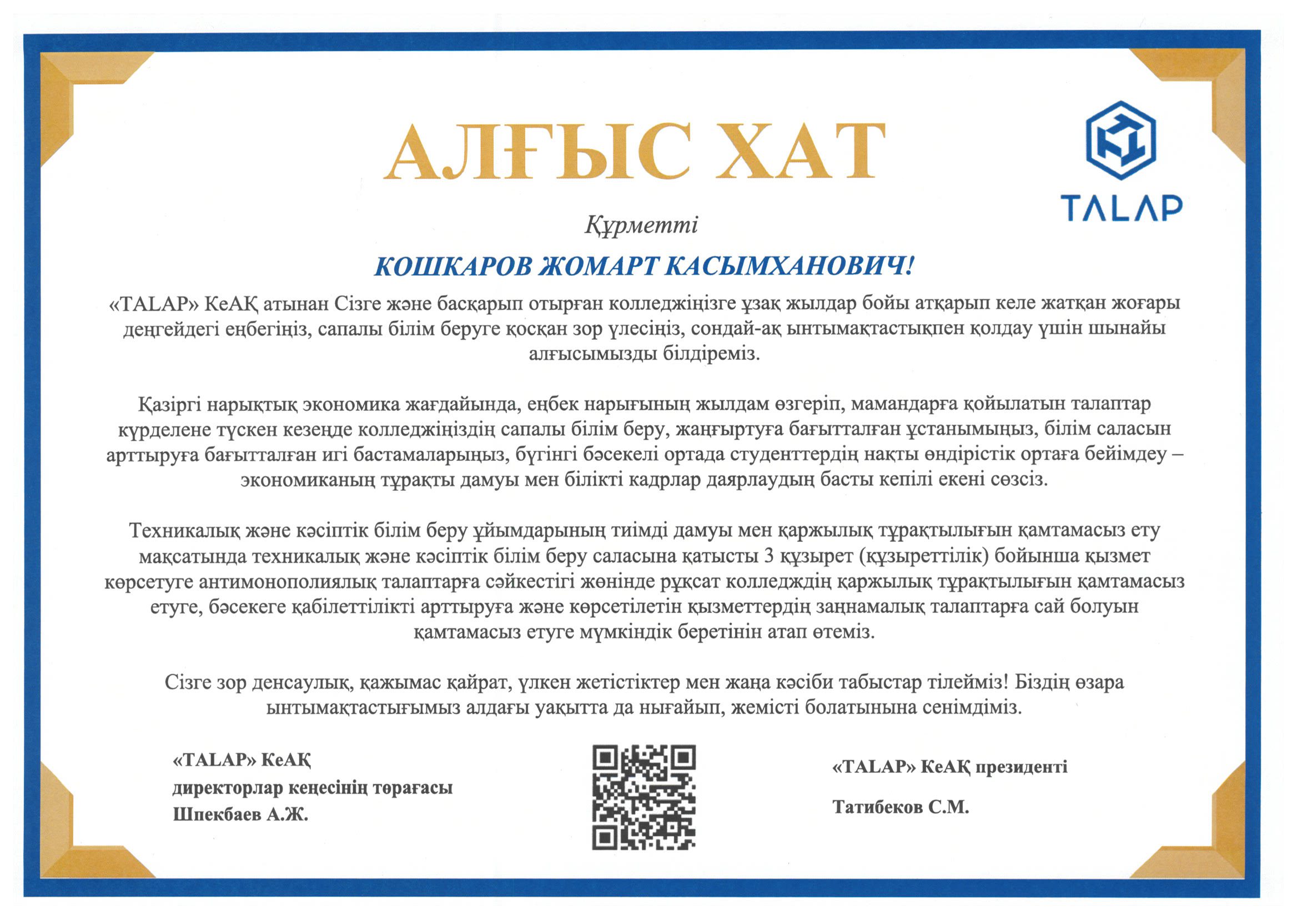 Жұмысшы мамандықтар жылы аясында жұмысшы мамандықтарын насихаттауға және еңбек адамының имиджін қалыптастыруға қосқан үлесі үшін.