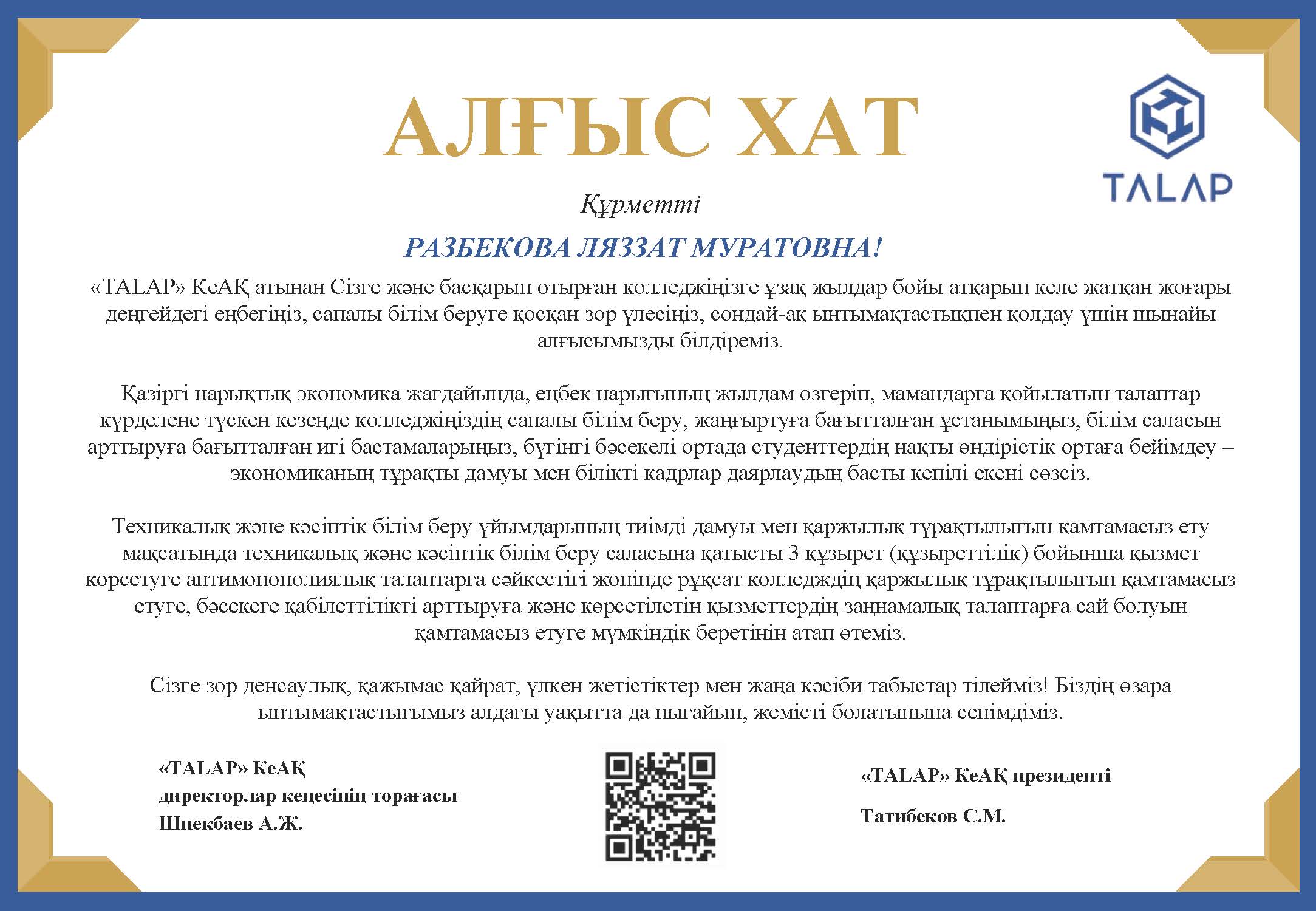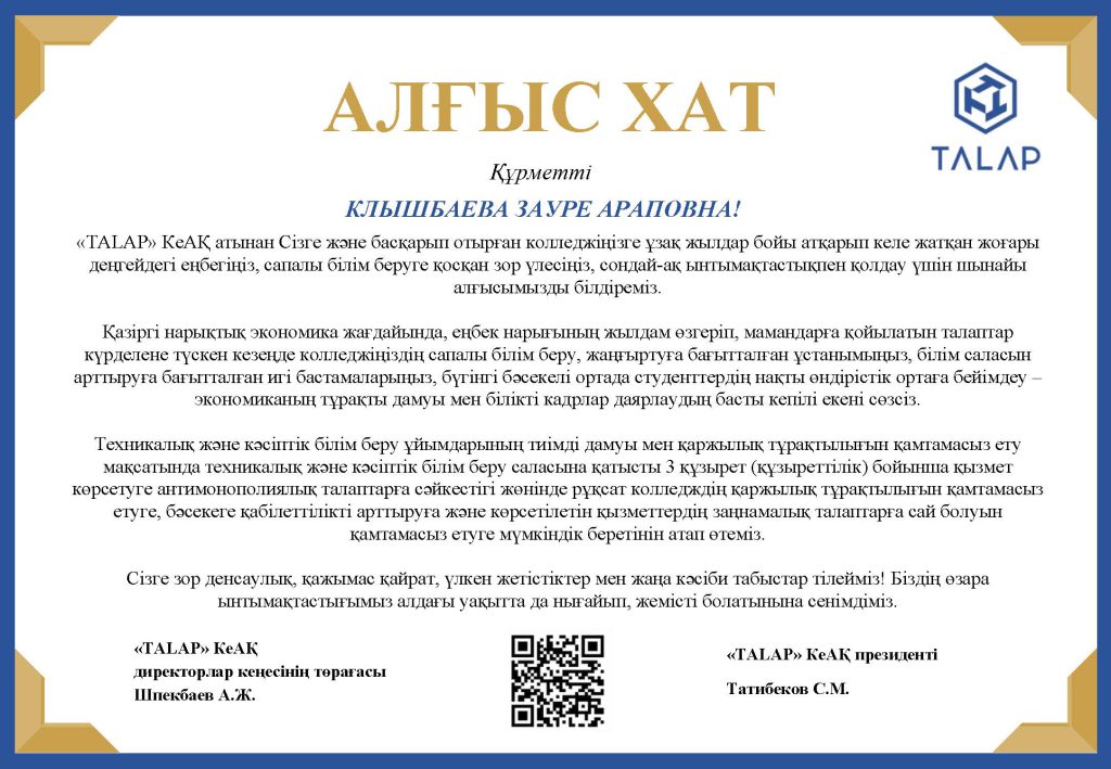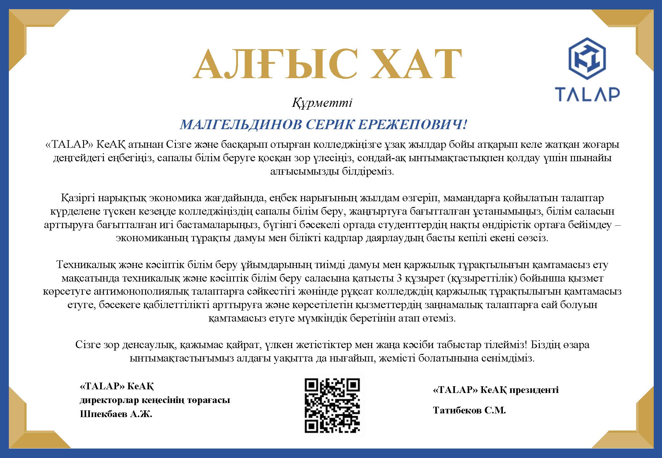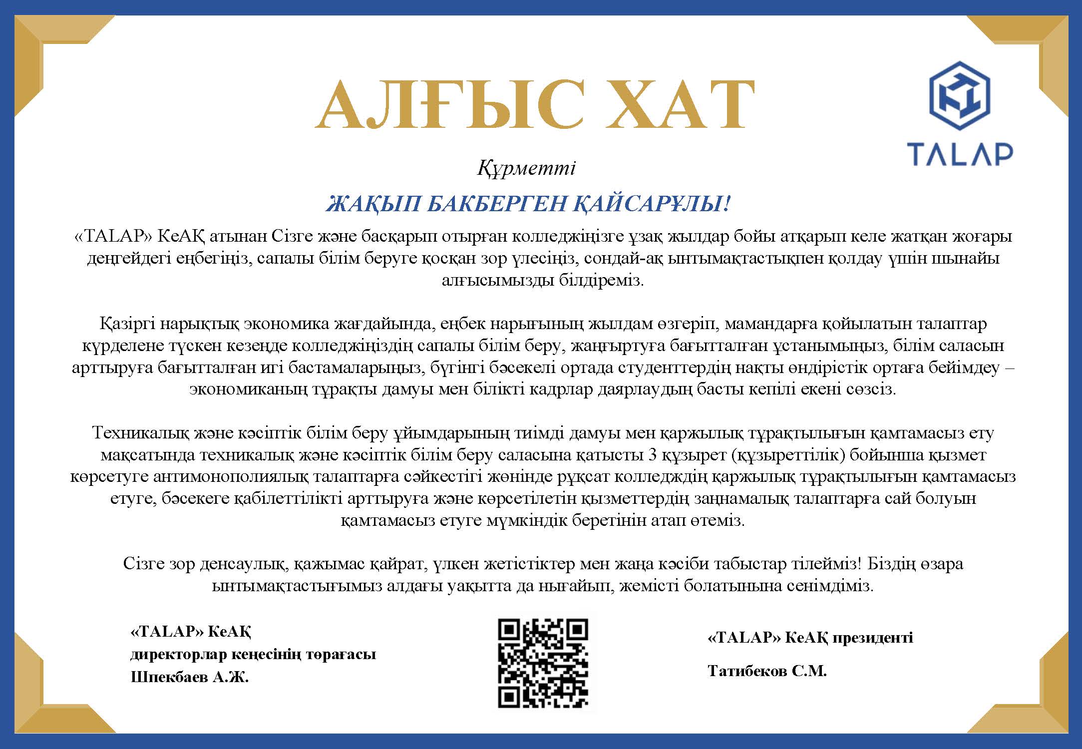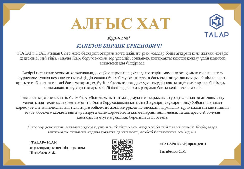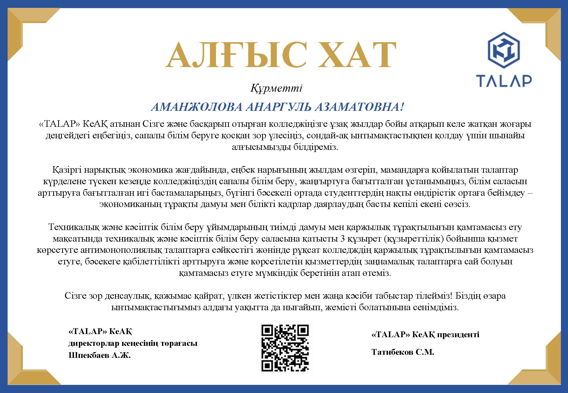 Жұмысшы мамандықтар жылы аясында жұмысшы мамандықтарын насихаттауға және еңбек адамының имиджін қалыптастыруға қосқан үлесі үшін.