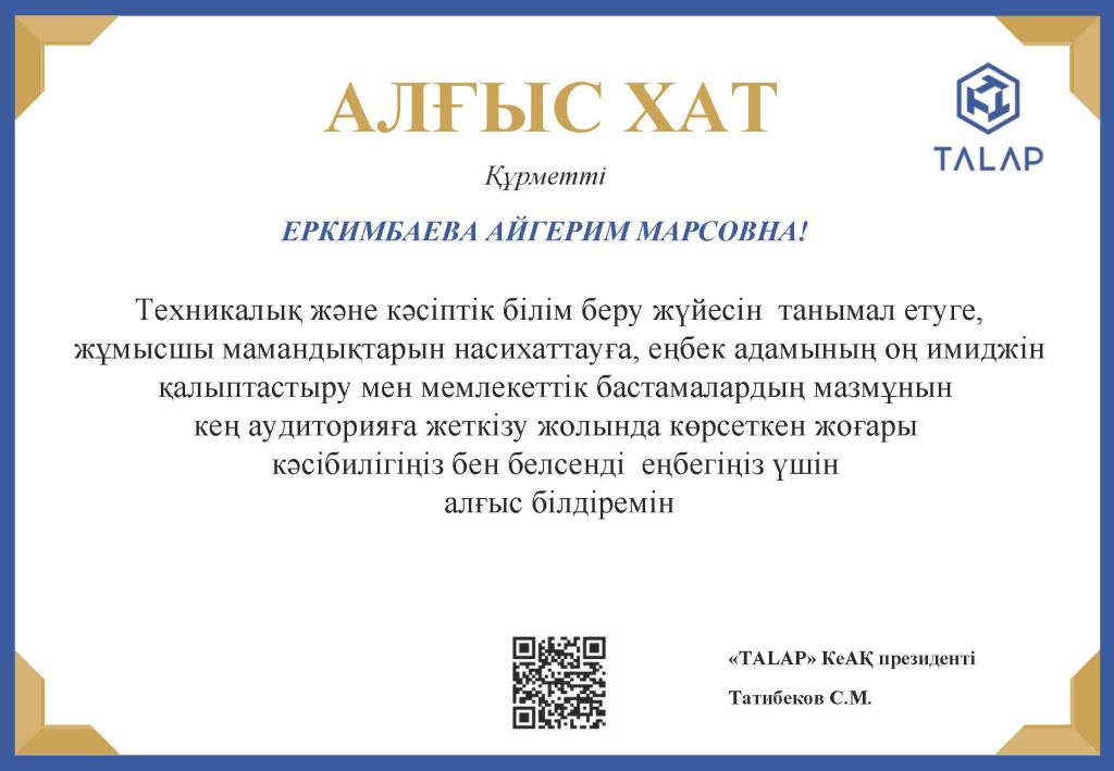 Жұмысшы мамандықтар жылы аясында жұмысшы мамандықтарын насихаттауға және еңбек адамының имиджін қалыптастыруға қосқан үлесі үшін.